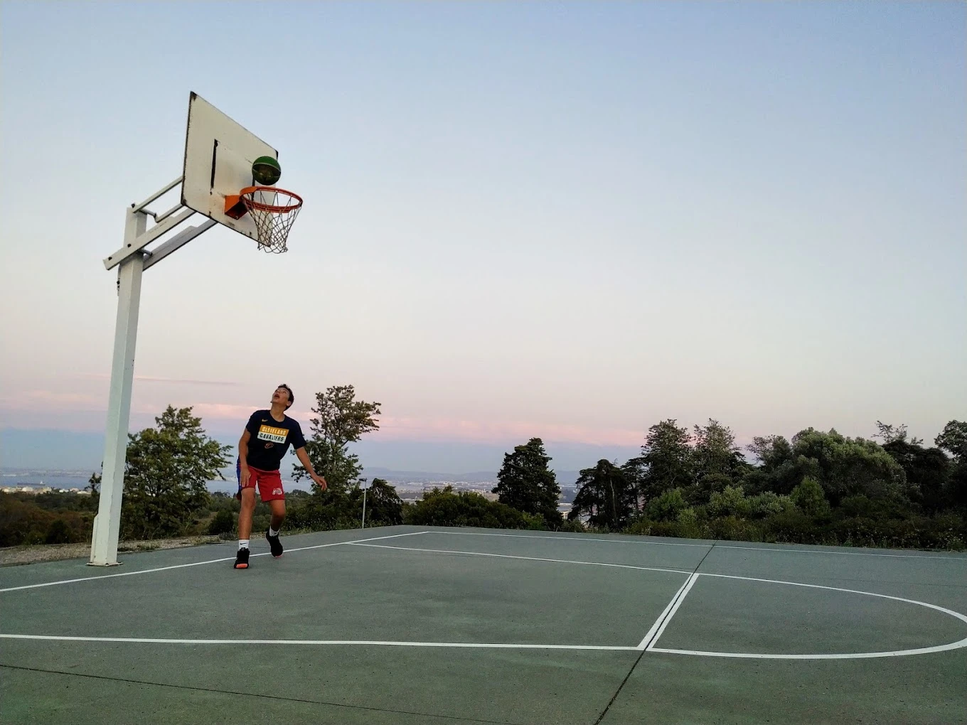 Jogar basquetebol ao ar livre com vista para o rio