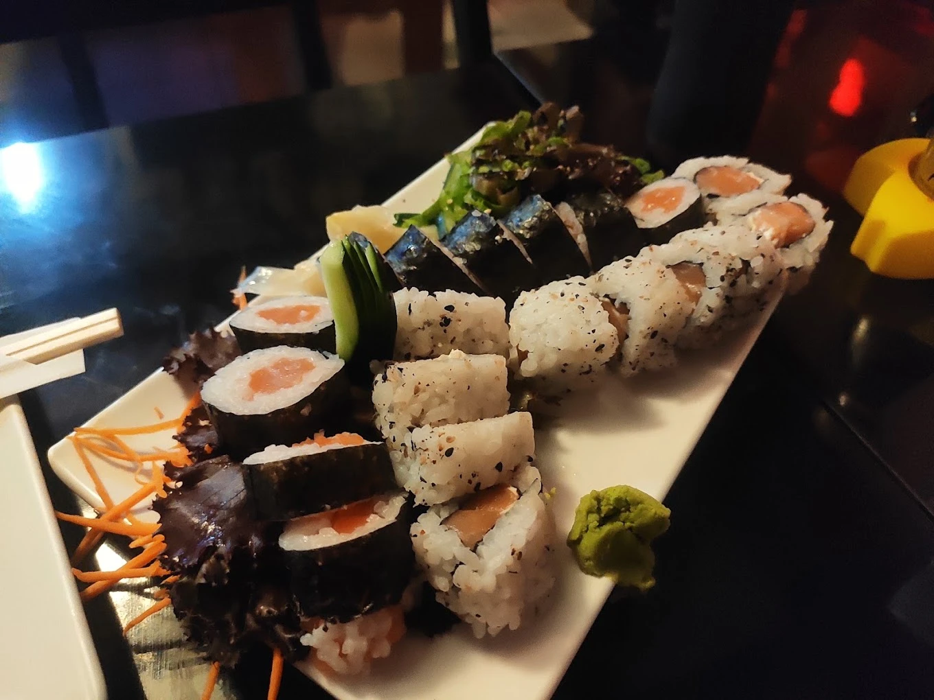 Ambiente temático com pratos orientais frescos e variedade em opções de sushis e rolls.